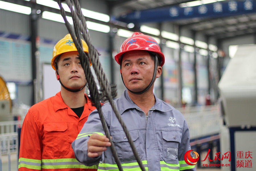 拆裝橫向支撐設(shè)備前,李廣輝與工友一同檢查卷揚(yáng)機(jī)的安全性能。中交一公局 供圖